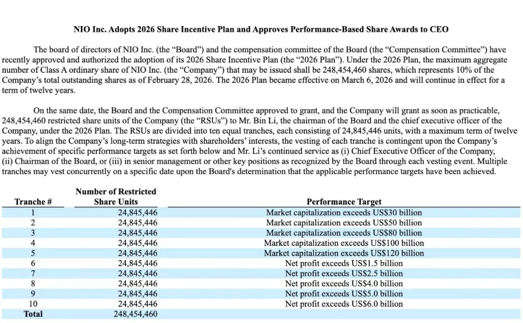 财报发布同时,蔚来董事会批准通过了 2026 年股份激励计划,为李斌授出约 2.48 亿股限制性股份。这笔限制性股份分为等额 10 批,但需公司市值及净利润达到一定目标后方可归属,第一阶段目标为公司市值超过 300 亿美元、最终目标为公司净利润超过 60 亿美元。股份激励计划最长期限为 12 年。