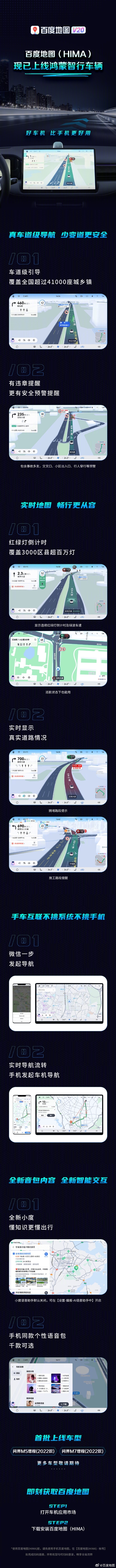 据悉,百度地图V20(HIMA)支持车道级导航,覆盖全国超过4.1万座城乡镇,具有违章提醒功能,包含事故多发、交叉口、小区出入口、行人穿行等预警。