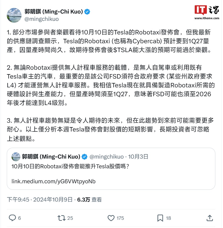 IT之家 10 月 10 日消息,天风国际分析师郭明錤昨晚在 X 平台发文,表达了自己对特斯拉 Robotaxi 的看法,他表示期待发布会后特斯拉能够大涨的预期可能过于乐观。