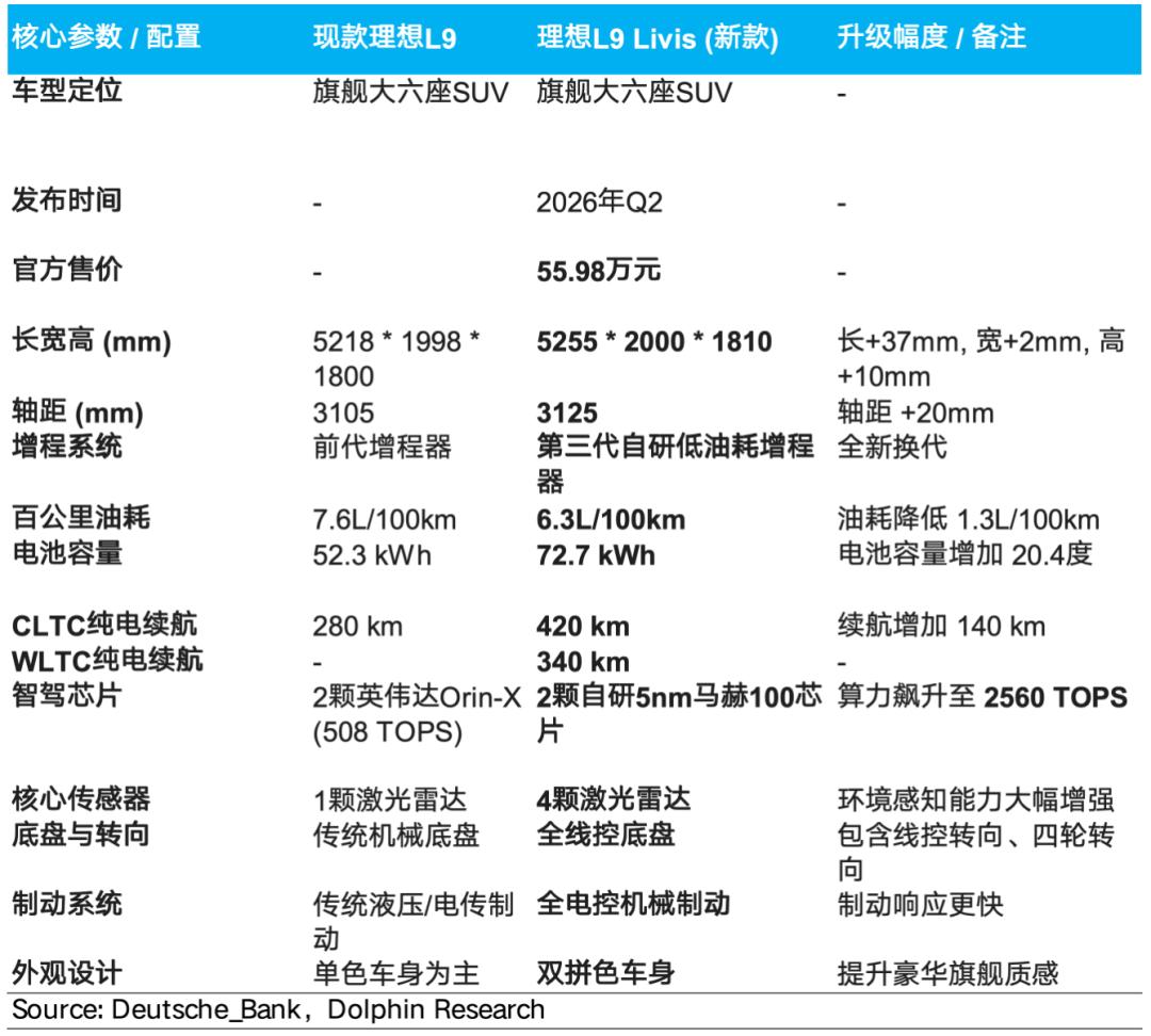 理想即将在2026年二季度开始推出3款理想L系列的大改款车型,其中率先在二季度上市的是理想L9,预计L9整体价格带将继续下沉到原L8系列的32-38万元(其中旗舰版本L9 LIVIS目前定价55.98万)