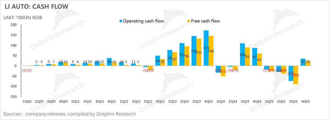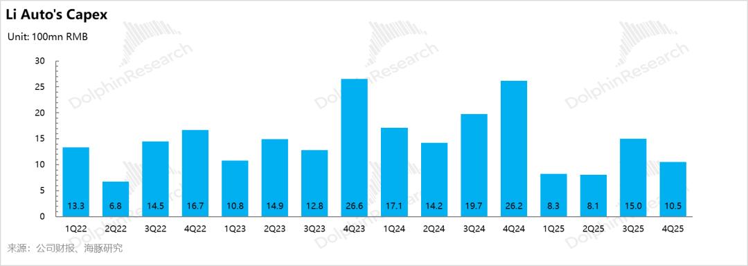 本季度销售和管理费用26.5亿,环比下滑1.2亿元,低于市场预期的27.4亿元,可能主要因为a. 四季度理想对营销部门进行了一定的裁员,营销部门合并后,直营门店一线销售淘汰 15%),缩减了薪酬开支;b. 新车上市相关的营销费用投入的减少(主要集中在三季度);c. 新增渠道铺设上,理想已经从前期的“激进扩张”转向“谨慎经营”。四季度,全国仅新增 6 家零售中心和 15 家服务中心。而进入 2026 年一季度后,理想甚至裁撤并优化部分低效门店来降低成本。