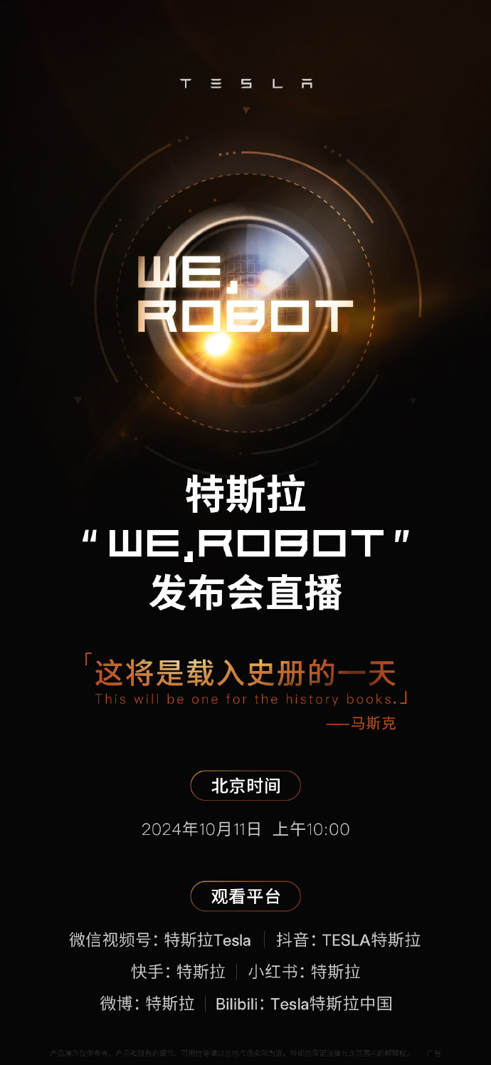 IT之家 10 月 10 日消息,特斯拉今日在微博宣布,特斯拉“WE, ROBOT”发布会将于北京时间 10 月 11 日上午 10 点举行,届时特斯拉将在微信视频号、抖音、快手、小红书、B站等多个社交平台进行直播。