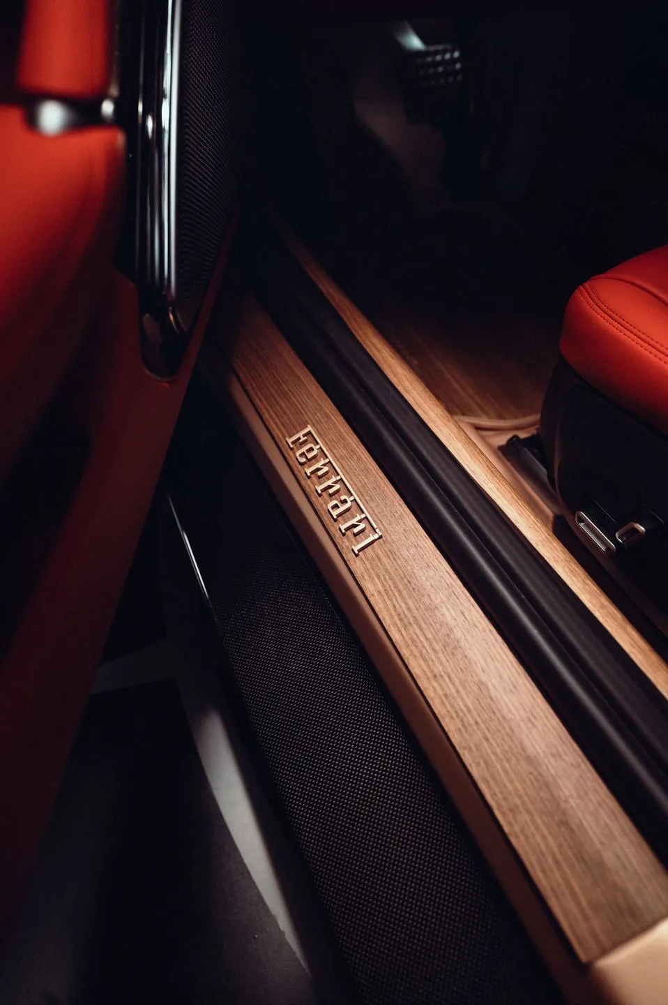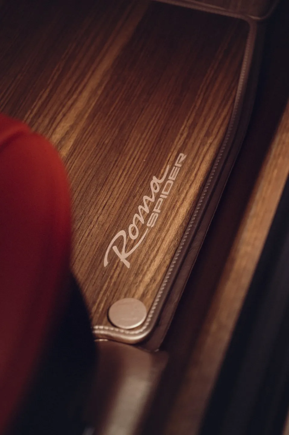 内饰方面,新车采用了红黑配色,并辅以金色饰条点缀。换挡区域使用了由回收材料制成的金色磨砂饰板。此外,车内还大量使用了木质装饰,门槛处设有金色的法拉利 Logo,车内还印有 Roma Spider 艺术字体,彰显出定制车型的独特性。