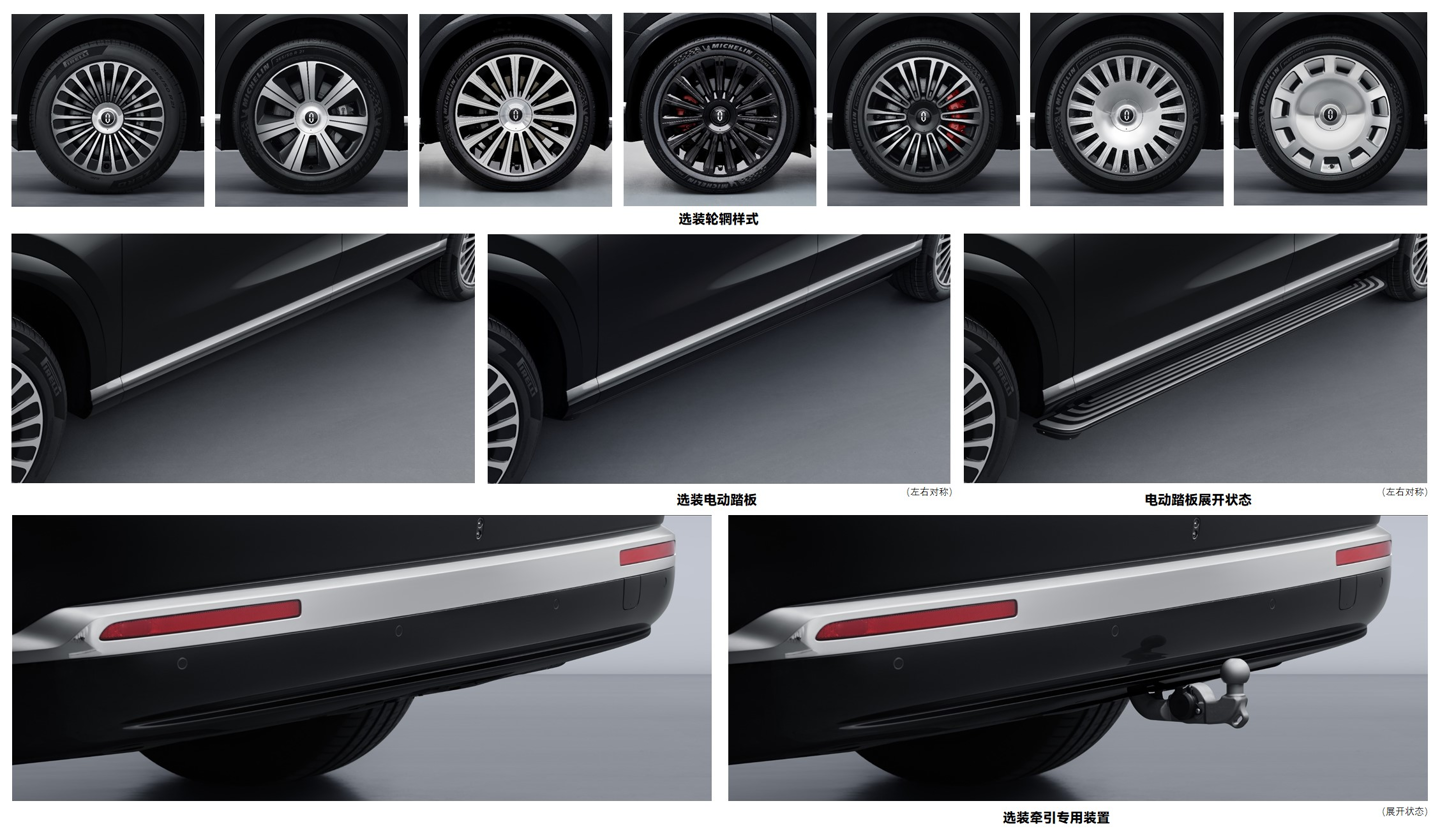 选装配置方面,新车提供了多款轮毂、电动踏板和车尾拖钩。其中,轮毂既有强调运动属性的黑化多辐条设计,也有主打豪华的“大饼”造型。