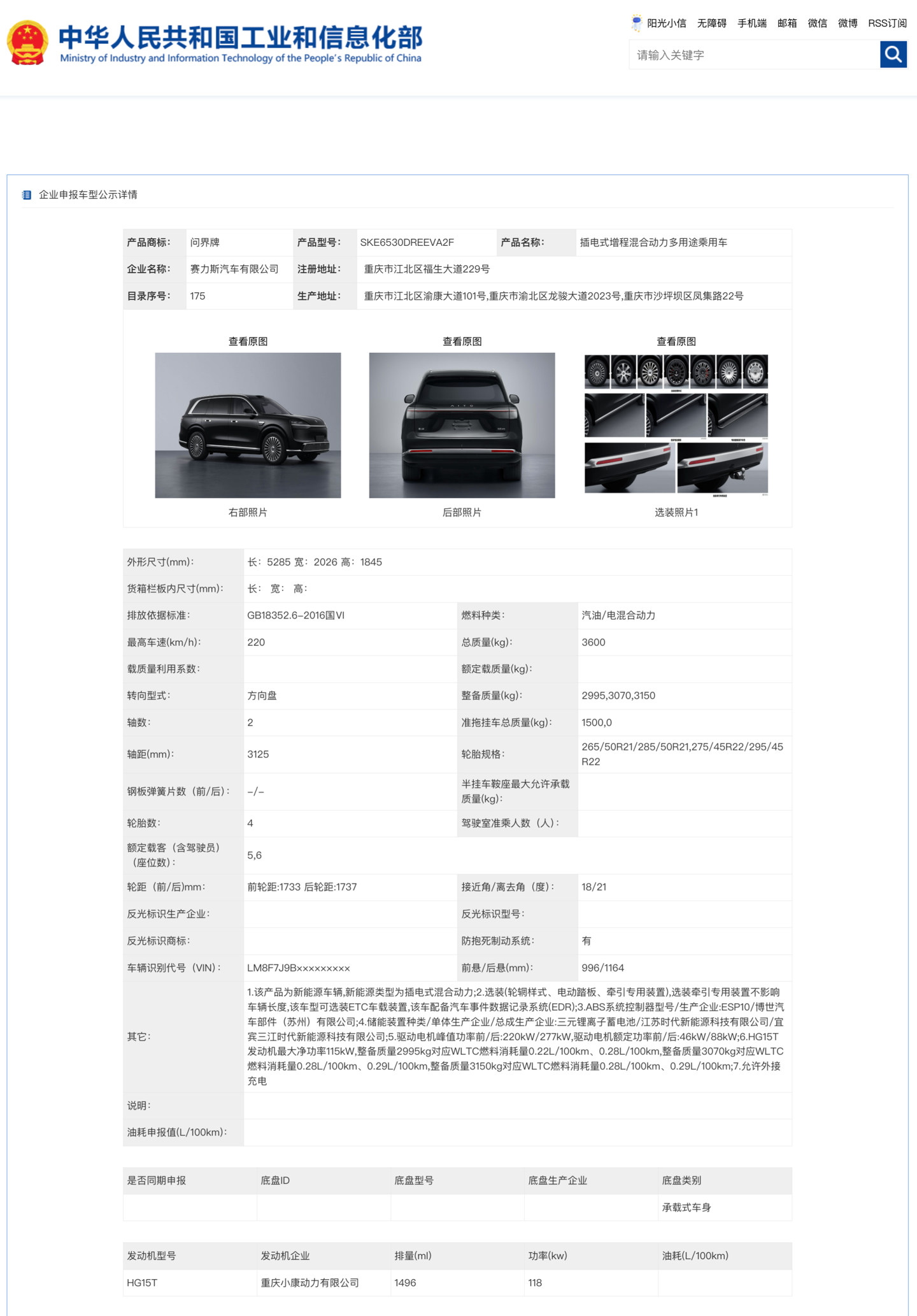 增程版:搭载重庆小康动力的 1.5T 增程器,排量 1496ml,功率 118kW;前后电机功率分别为 220kW/277kW。