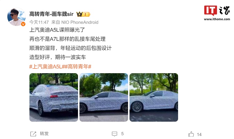 IT之家 10 月 10 日消息,近期多名博主晒出了一组上汽奥迪 A5L 的路试谍照,该车基于 PPC 平台打造,采用三厢掀背造型,将于明年在上汽大众安亭三厂投产,与一汽奥迪 A5L 形成差异化。