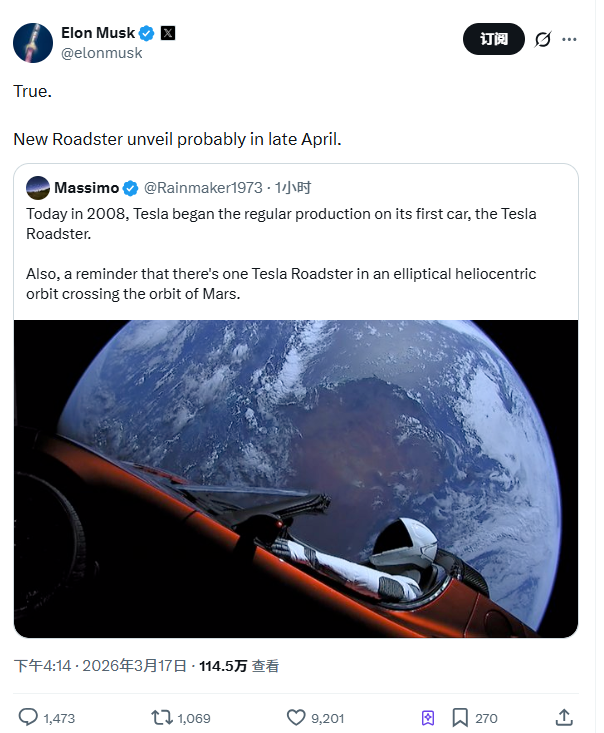 凤凰网科技讯 3月17日,特斯拉首席执行官埃隆·马斯克今日通过社交平台X对外透露,旗下新款Roadster电动跑车预计将于四月下旬正式发布。这一最新表态意味着,该车型的实际亮相节点较此前规划的4月1日有所推迟。