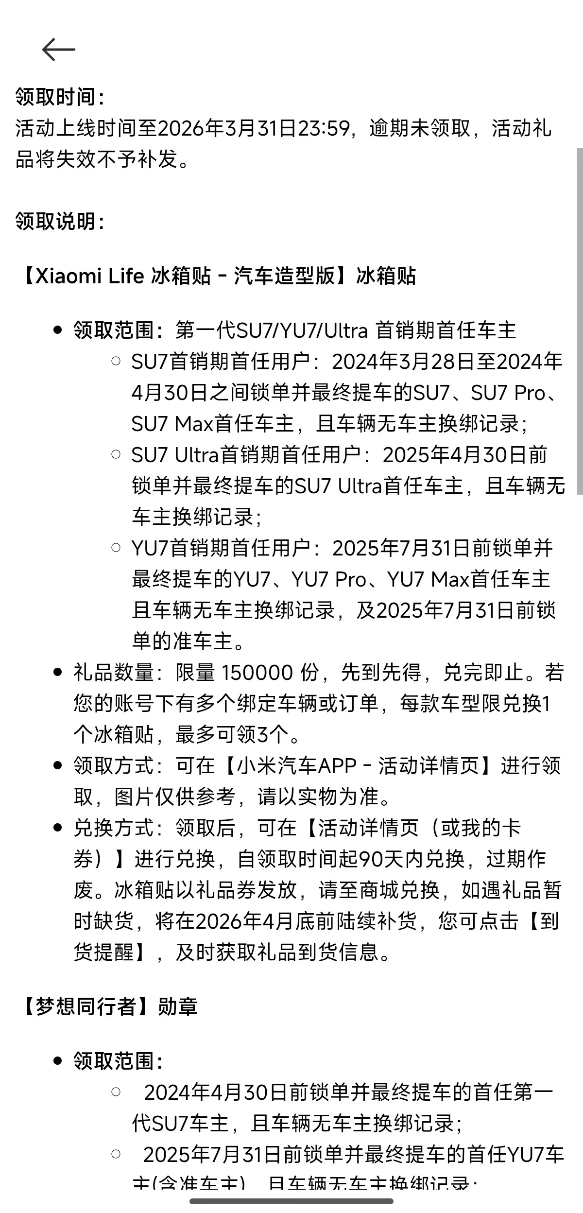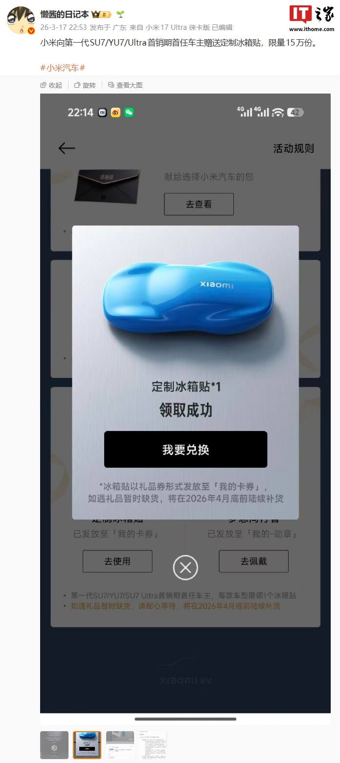 IT之家 3 月 17 日消息,据博主 @懒酱的日记本 分享,小米向第一代 SU7 / YU7 / Ultra 首销期首任车主赠送定制冰箱贴,限量 15 万份。