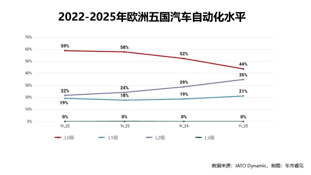 报告显示,欧洲五大汽车市场中,新车自动化渗透率正经历快速跃升。2022年,还有近59%的新车未配备任何形式的自动驾驶功能;而到2025年,这一比例已锐减至44%以下。