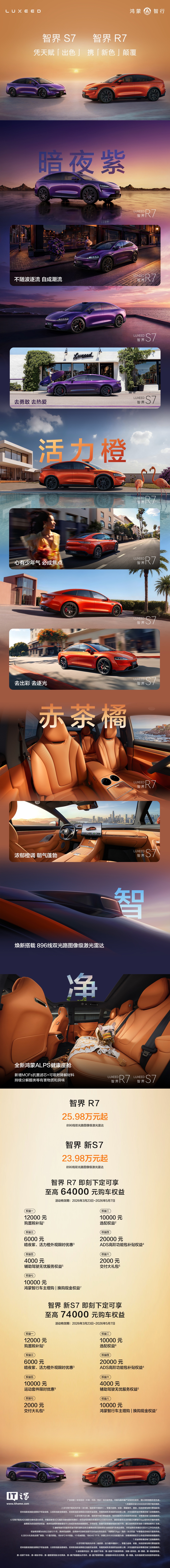 《鸿蒙智行智界 R7 / 新 S7 “暗夜紫”“活力橙”配色上市:23.98 万元起,配 896 线激光雷达》