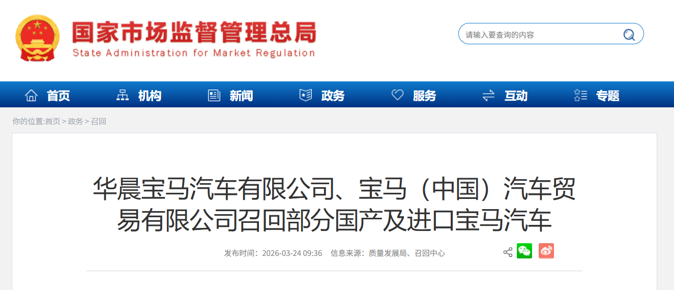 IT之家 3 月 24 日消息,IT之家从国家市场监督管理总局获悉,日前,华晨宝马汽车有限公司、宝马(中国)汽车贸易有限公司根据《缺陷汽车产品召回管理条例》和《缺陷汽车产品召回管理条例实施办法》的要求,向国家市场监督管理总局备案了召回计划。