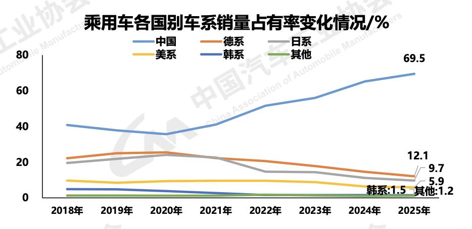 日系车企在华份额也正逐渐衰落。根据中国汽车工业协会的数据,2025年,中国品牌乘用车销量占有率为69.5%,外资、合资为30%左右,其中,日系占有率排在德系之后,为9.7%。