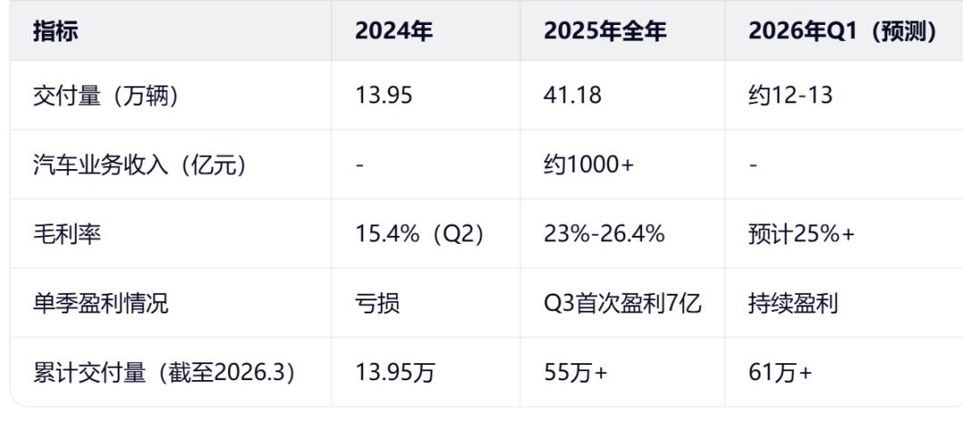 表:小米汽车关键经营数据对比(2024-2026)