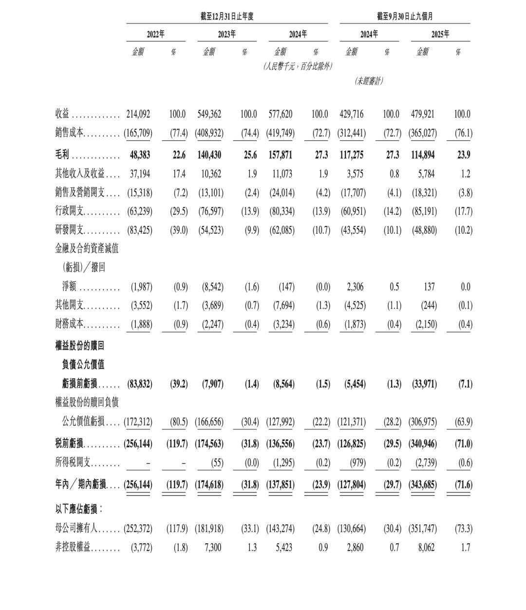 报告期内,泽景的总收入分别约2.14亿、5.49亿、5.78亿、4.80亿元;毛利分别约4838.3万、1.40亿、1.58亿、1.15亿元,毛利率分别为22.6%、25.6%、27.3%、23.9%;净亏损分别约2.56亿、1.75亿、1.38亿、3.44亿元,三年多累计亏损约9.13亿元,经调整净利润分别约-7913.2万、1331.3万、-713.1万、-1745.2万元。