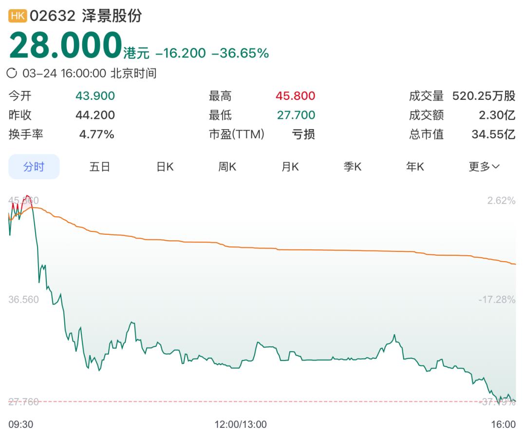 今日开盘,泽景微跌0.68%报43.90港元。截至收盘,泽景跌36.65%报28港元,总市值34.55亿港元,盘中最低触及27.7港元。
