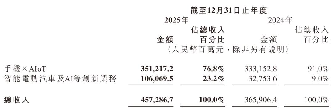 小米集团2025年手机×AIoT分部收入3512亿元,较上年同期的3331.5亿元增长5.4%,占营收的比例为76.8%。