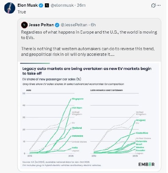 该观点认为,石油领域频繁波动的地缘政治风险,正在成为加速全球弃油转电的催化剂。特斯拉首席执行官马斯克对此深表认同,并简洁地回应称,这确实是正在发生的事实。