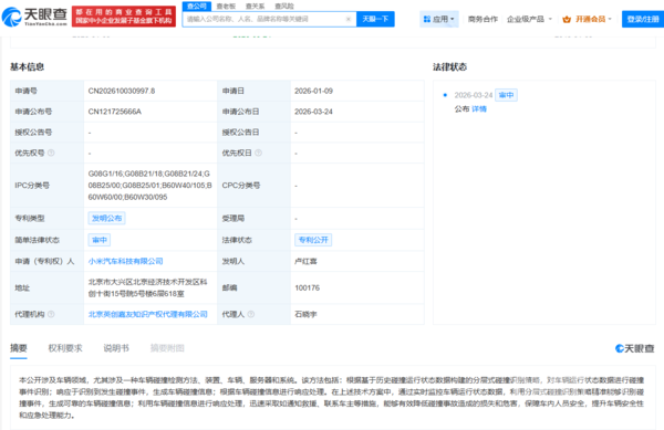 据悉,小米汽车此前已布局相关技术。2025年8月,小米汽车科技有限公司与北京小米移动软件有限公司联合申请的“碰撞检测方法、装置、存储介质及程序产品”专利公布。该专利通过终端设备(如智能手机)实时监测交通工具运行状态,在检测到用户处于搭乘状态时,系统持续分析速度异常变化,一旦判定为“发生碰撞状态”,立即触发报警操作。