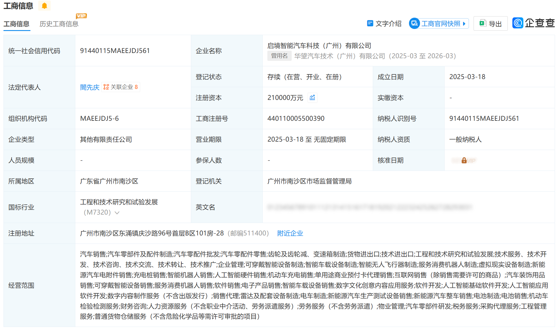 3月24日,由广汽集团和华为共同打造的独立高端智能电动汽车品牌华望汽车公司名称华望汽车技术(广州)有限公司正式更名为启境智能汽车科技(广州)有限公司。