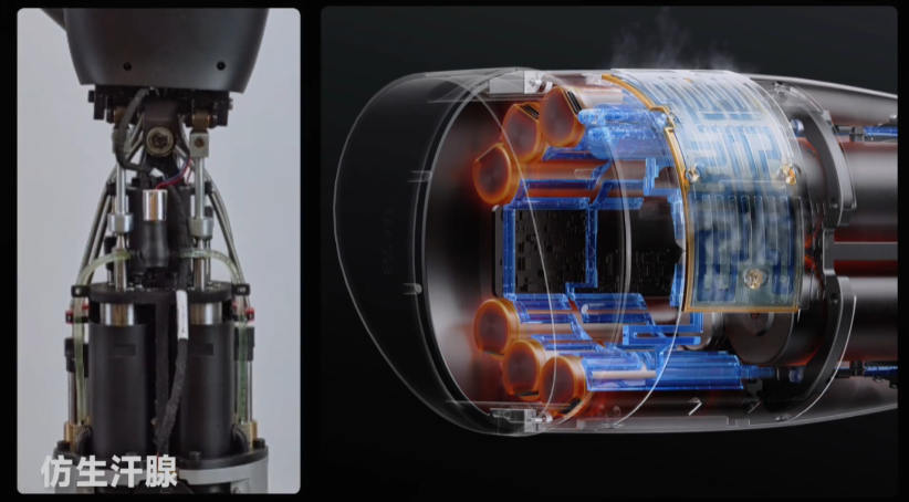 在常规被动散热外,小米尝试模拟人类汗腺这种高效方式来进行主动散热(室温下 1 mL 水蒸发可带走 2000 焦以上热量),在紧凑的小臂结构中,采用金属 3D 打印制作液冷循环通道,通过微泵将电机热量转移至蒸发区,利用蒸发吸热快速降温。