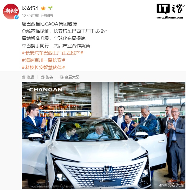 IT之家 3 月 27 日消息,长安汽车今日宣布,位于阿纳波利斯(Anápolis)的高度自动化生产线正式竣工投产。中国驻巴西大使祝青桥陪同巴西总统卢拉、副总统阿尔克明、阿纳波利斯市长等政要出席活动并共同见证这一重要时刻。