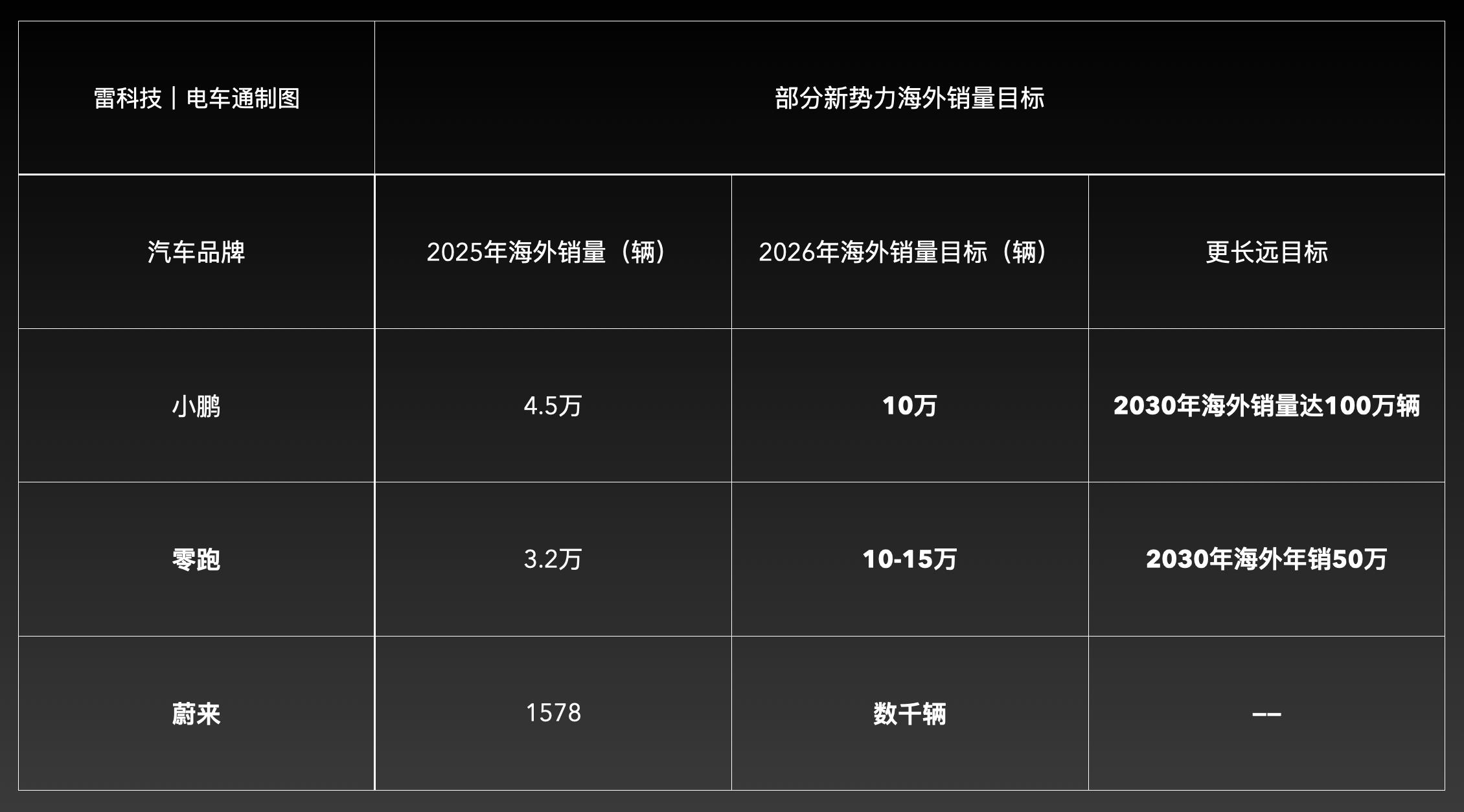 存量竞争加剧之下,新势力要想保住自己的地位,必须在全球市场寻找新增长曲线。目前,已经透露2026年海外销量目标的新势力品牌就有三家,具体可看以下表格。