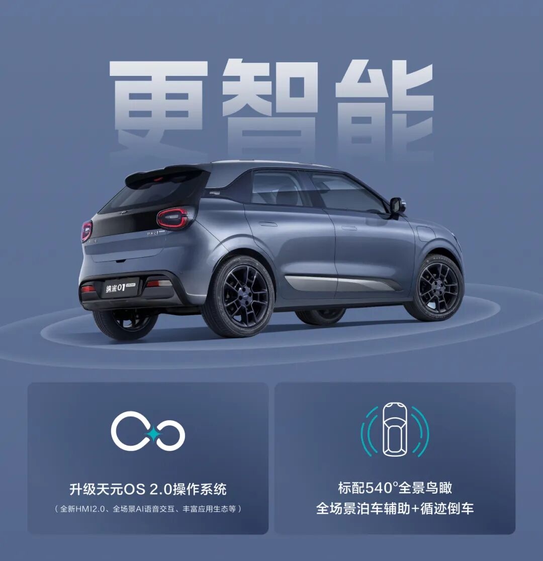 作为对比,现款纳米 01 动力采用单电机,最大功率 70 千瓦,可选 31.45 千瓦时和 42.3 千瓦时两种规格的电池,CLTC 工况下续航分别为 310 公里-330 公里、410 公里-430 公里,适合城市代步、中短途出行等。