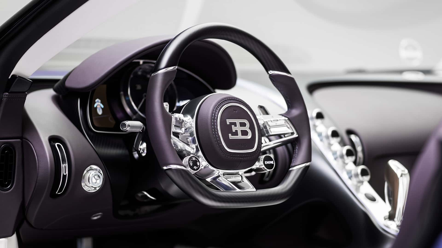 头枕上的刺绣采用对称构图,车门内饰板上的花瓣图案呈现出动态效果,仿佛随风流动。所有设计细节都围绕布加迪强调的“动感”展开。