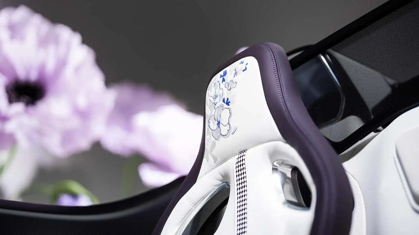 整车设计在莫尔塞姆与柏林设计工作室之间完成,由色彩与材质团队主导。灵感来源跨越花卉与高级时装领域,同时融入普罗旺斯薰衣草田和巴黎花园的意象。整体风格轻盈而克制,在视觉平衡之上叠加对细节的极致打磨。
