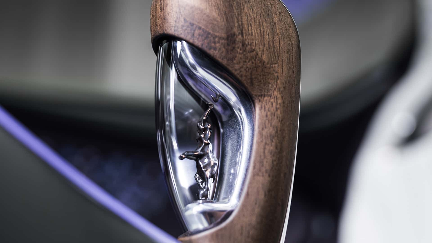 换挡杆内部则嵌入伦勃朗 · 布加迪的经典雕塑“舞动的大象”,并置于与整车色调一致的染色玻璃之中,将品牌的艺术传统与现代工艺连接起来。
