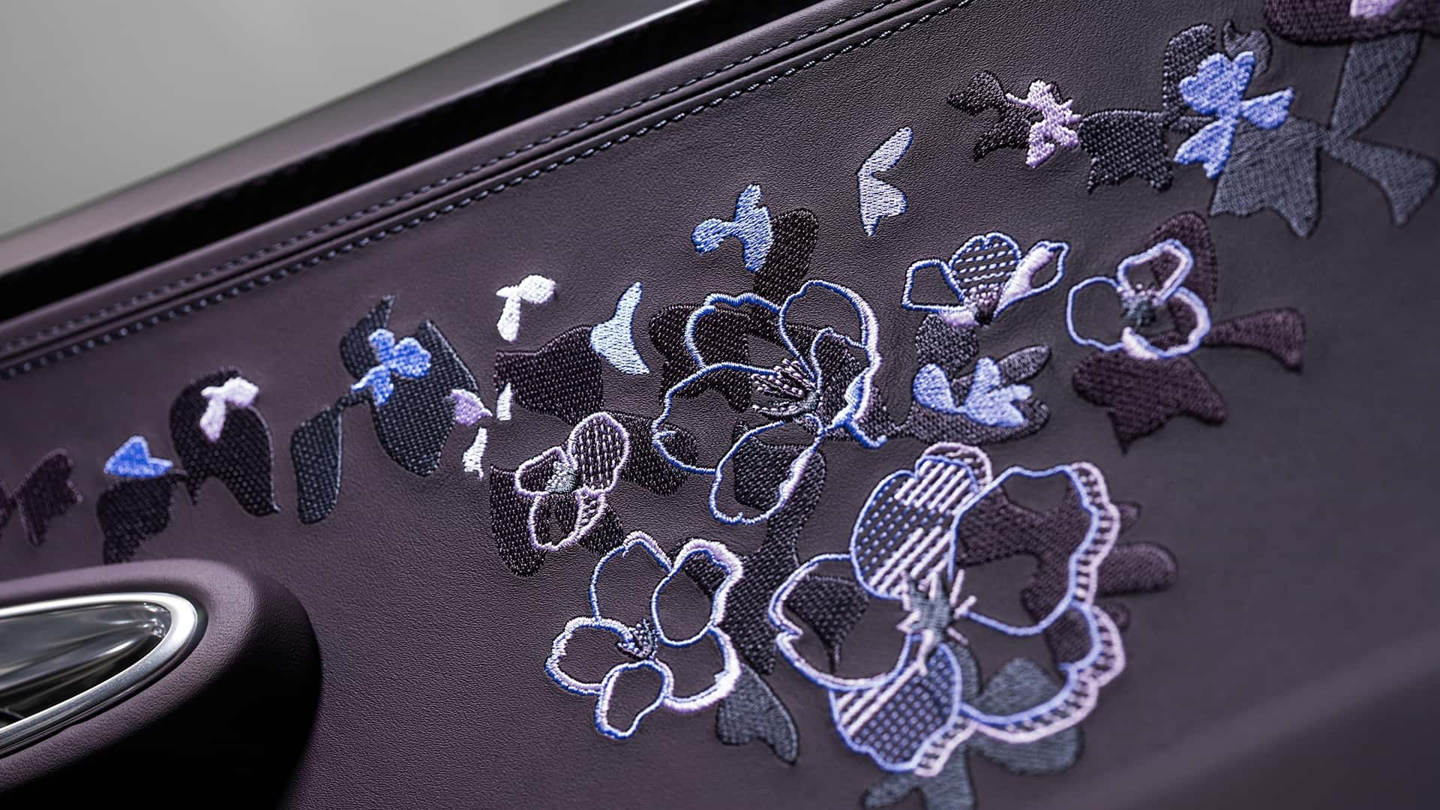 内饰延续同一套设计逻辑,以浅色与深色皮革、紫色点缀以及碳纤维共同营造出统一的氛围。花卉元素通过复杂刺绣再次出现,数千针叠加形成具有层次的视觉效果。
