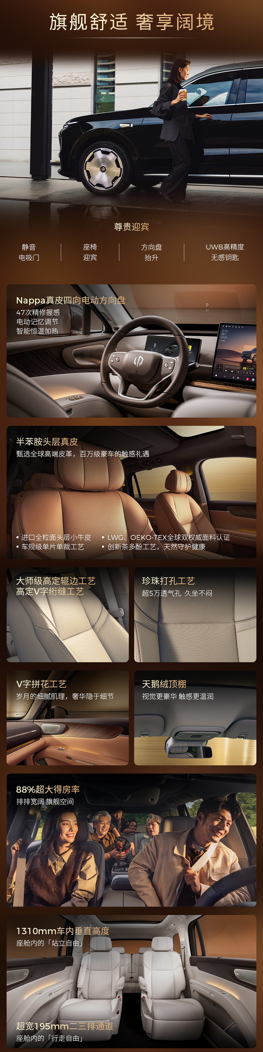 车辆二排将配备零重力座椅、双折叠桌板、头顶娱乐屏、冰箱以及功能控制屏。此外,新车还设置了 B 柱拉手,方便儿童、老人下车。三排配备了双扶手、一键电动折叠、座椅加热功能。