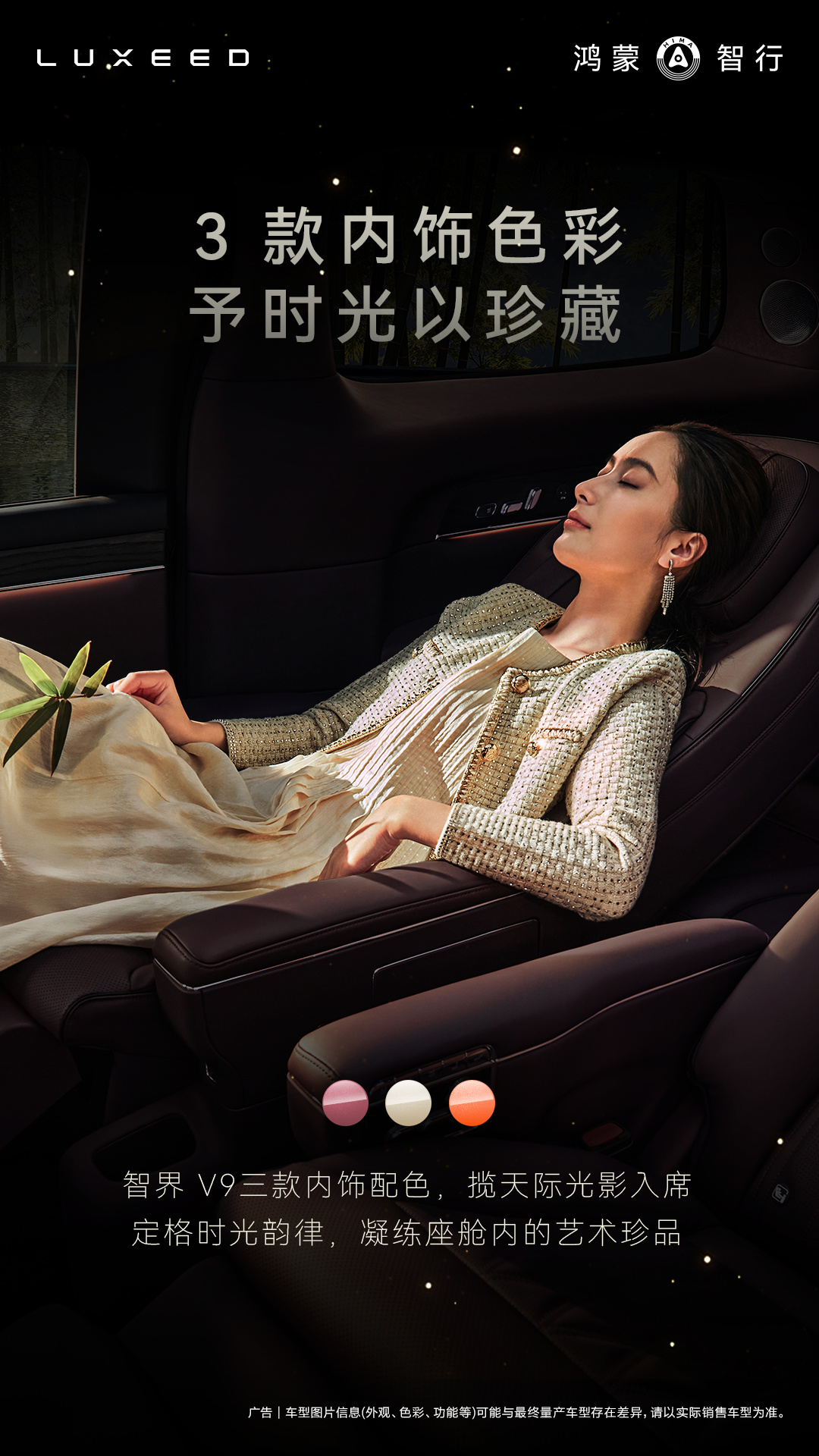 IT之家 3 月 31 日消息,智界汽车今日透露,智界 V9 将提供绒霞紫、韶华杏、赤茶橘三款内饰配色。作为鸿蒙智行首款旗舰 MPV 车型,智界 V9 还将搭载二排旋转座椅。