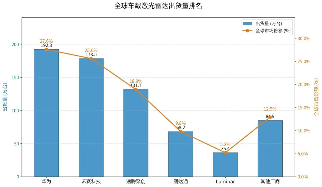 在全球车载激光雷达行业,中国的禾赛,速腾,华为,图达腾包揽前4强,合计拿下93%市场占有率。