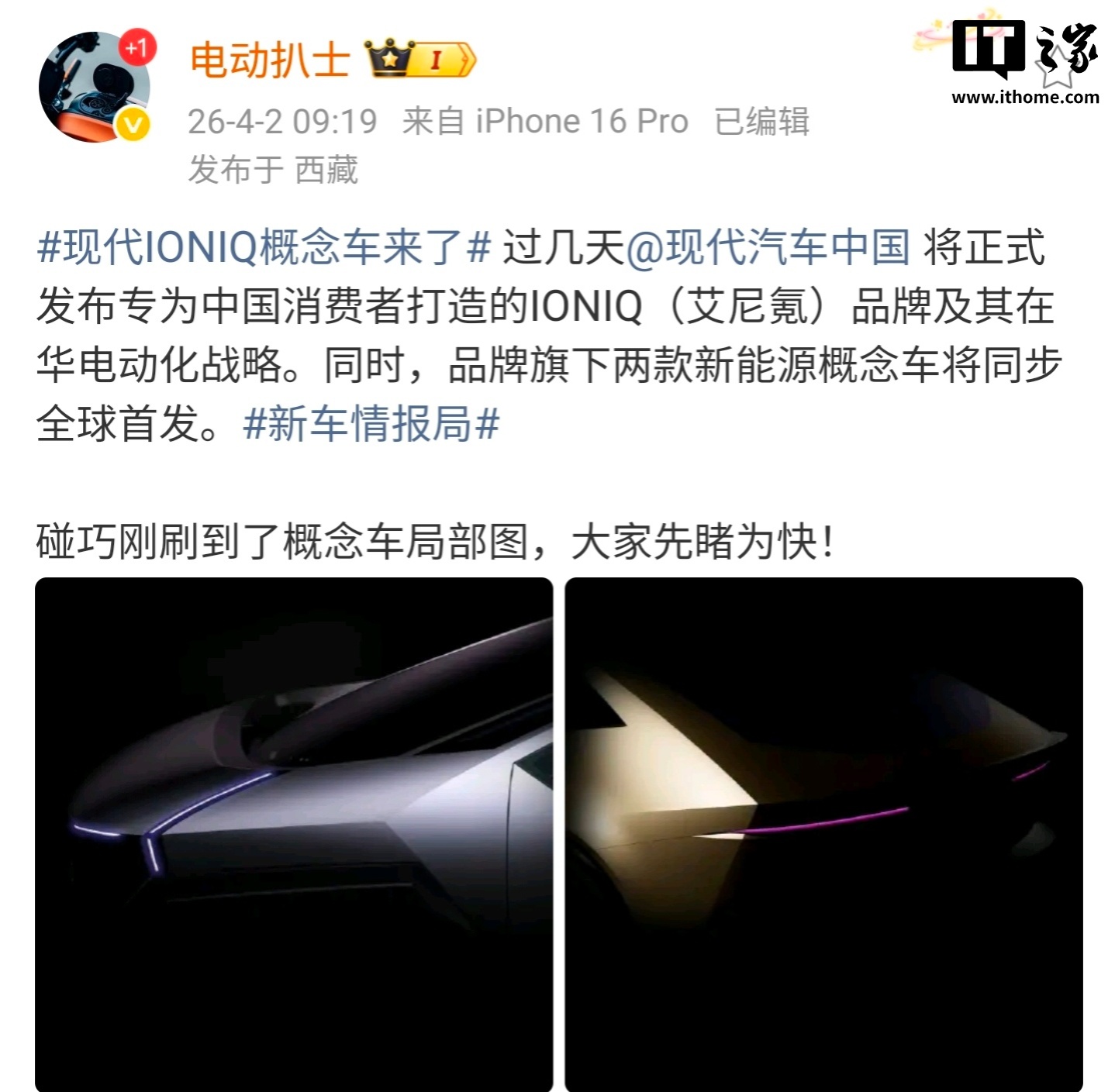 据博主 @电动扒士 透露,过几天,现代汽车中国将正式发布专为中国消费者打造的 IONIQ(艾尼氪)品牌及其在华电动化战略。同时,品牌旗下两款新能源概念车将同步全球首发。