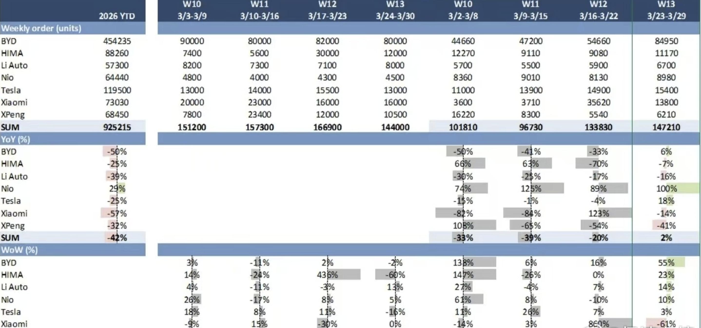 最关键的是,新一代SU7很可能仍未摆脱“首发订单依赖”。按照高盛公布的数据,2026年第13周(3月23日到3月29日),小米汽车订单量为13800台,环比下降61%,同比下降14%。