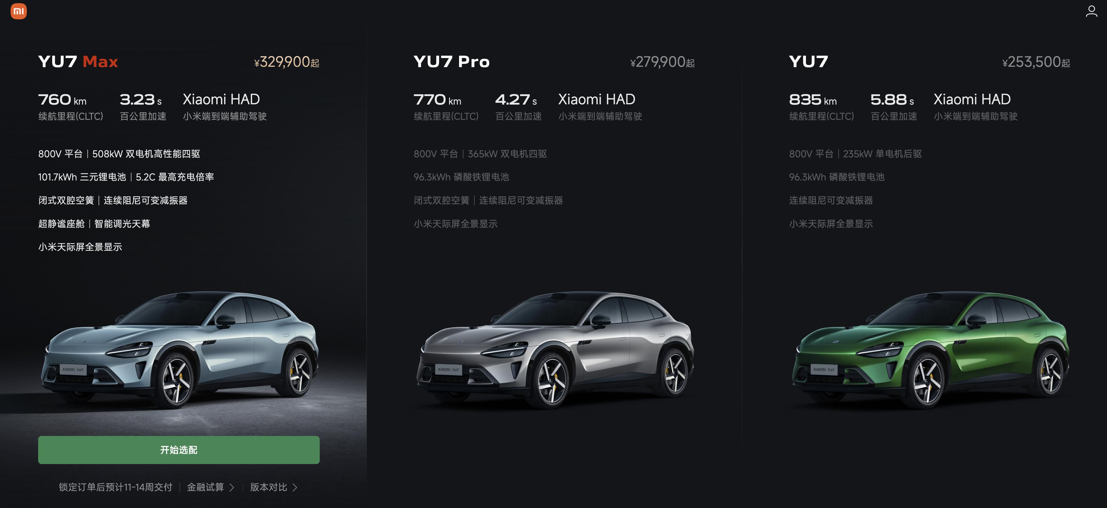 上市初期,YU7标准版预计交付周期长达53-56周,Pro版48-51周,Max版33-36周。如今,小米汽车官网显示,YU7标准版交付周期7-10周,Pro版9-12周,Max版11-14周。交付周期大幅缩短的背后,或许受到小米产能爬坡的影响,但更有可能是所剩订单不多了。