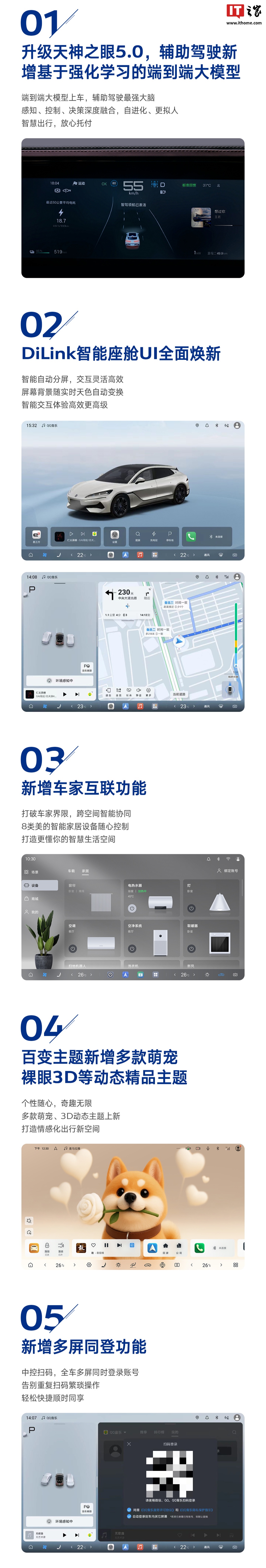 DiLink 智能座舱 UI 焕新:支持智能自动分屏,屏幕背景可随实时天色自动变换,智能交互体验高效更高级。