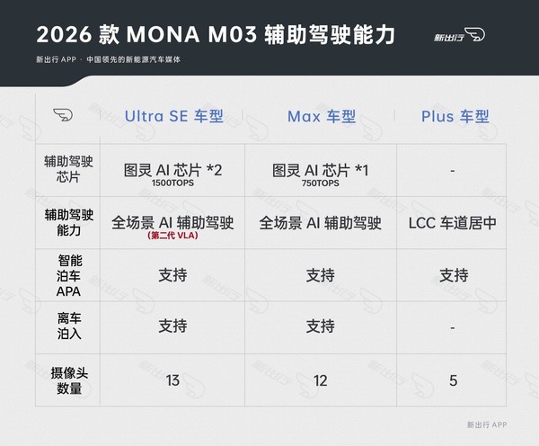 辅助驾驶方面,2026款小鹏MONA M03简化为Plus、Max、Ultra SE三个SKU,不同版本的辅助驾驶能力差异显著。其中,Ultra SE车型具备满血全场景AI辅助驾驶能力,配备第二代VLA;Max车型搭载端到端大模型,同样拥有全场景辅助驾驶能力;Plus车型则仅保留LCC车道居中功能,同时支持智能泊车功能。