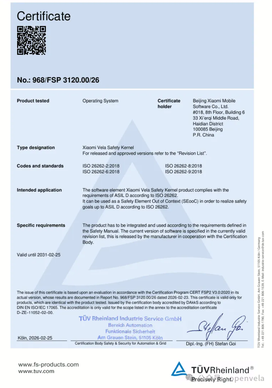 本次认证过程中,小米团队依托完善的功能安全管理体系,历经多轮交付件专项评审、认证机构现场核验与专家终审,全程严格遵循标准要求,顺利通过全部考核环节,充分印证了 Xiaomi Vela Safety 内核在车规安全领域的技术实力。