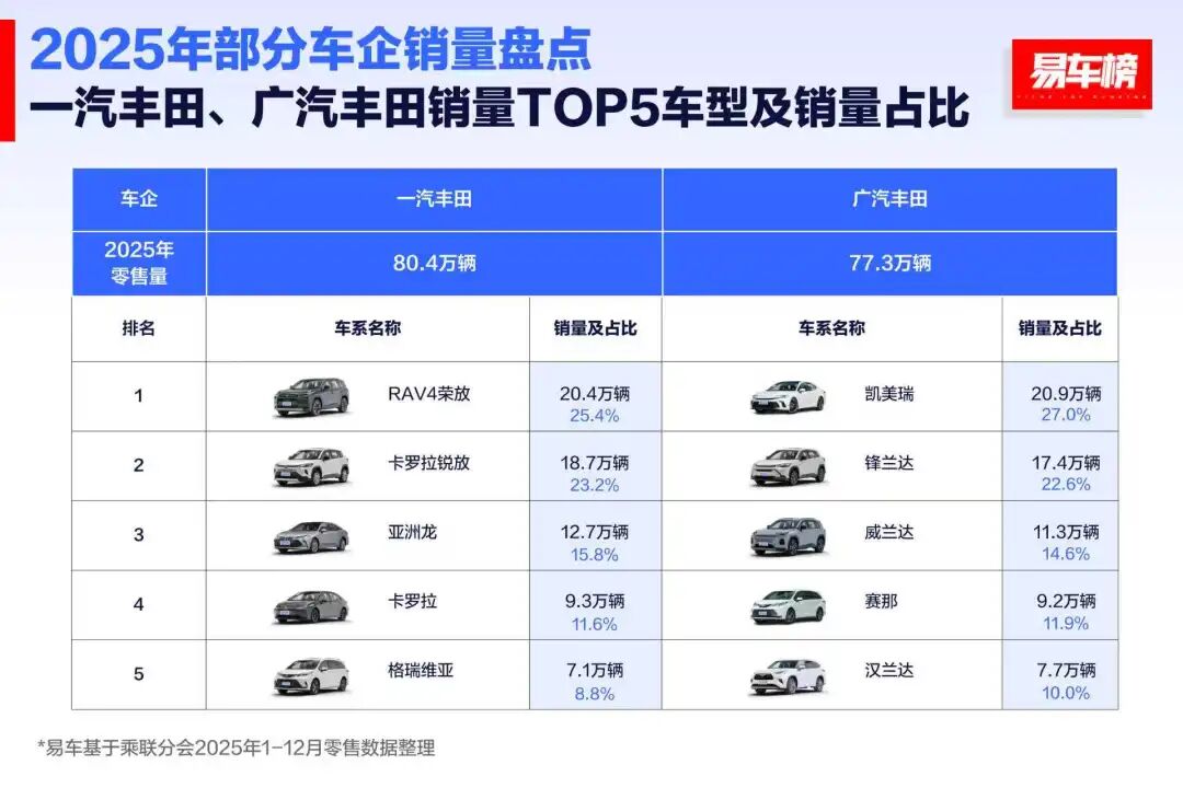 2025年,丰田是日系三强中唯一正增长的品牌,在华销量微增0.2%,达到178.4万辆。这个数字远超本田(64.5万辆)和日产(65.3万辆)之和。在全球市场,丰田更是以1132万辆的年销量稳坐第一名。