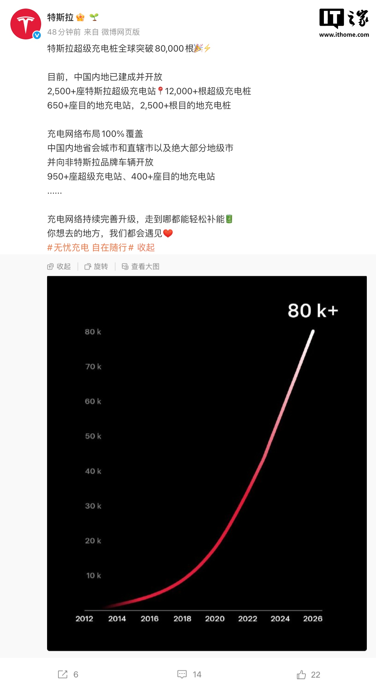 IT之家 4 月 4 日消息,今天下午,特斯拉通过官微宣布:特斯拉超级充电桩全球范围突破 80000 根。目前,中国内地已建成并开放超 2500 座特斯拉超级充电站、超 12000 根超级充电桩、超 650 座目的地充电站、超 2500 根目的地充电桩。