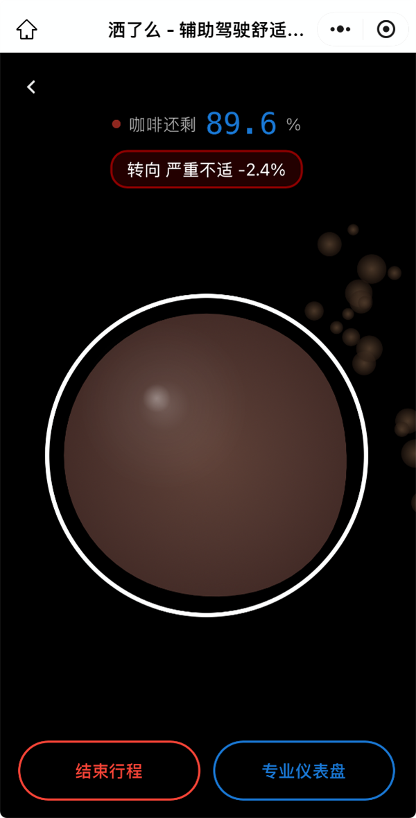测试开始后,它会记录行车过程中的加速度,每次遇到颠簸、急加减速、急打方向盘等操作,都会洒出一些咖啡,点击测试结束后会自动给出评测结果。