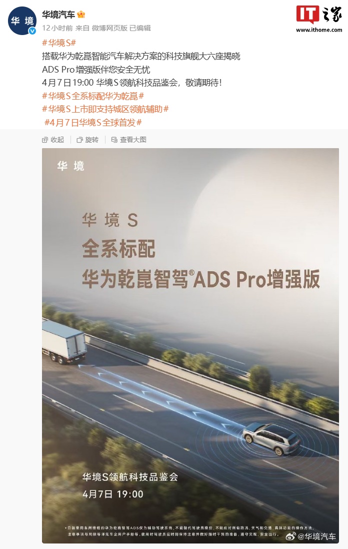 据介绍,新车将首批搭载华为乾崑舱内激光视觉 Limera。从官方海报来看,华境 S 领航科技品鉴会已定档 4 月 7 日 19:00 举行。