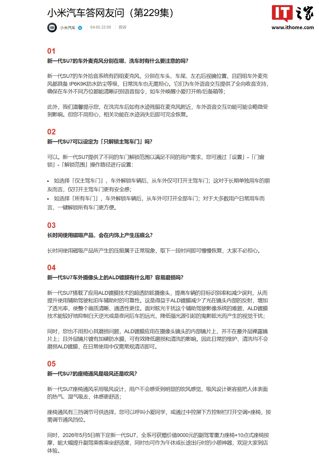 IT之家 4 月 5 日消息,小米汽车今日继续更新答网友问(第 229 集),针对新一代 SU7 的车外麦克风分别在哪、洗车时的注意事项、是否可以设定为「只解锁主驾车门」等问题进行了解答。