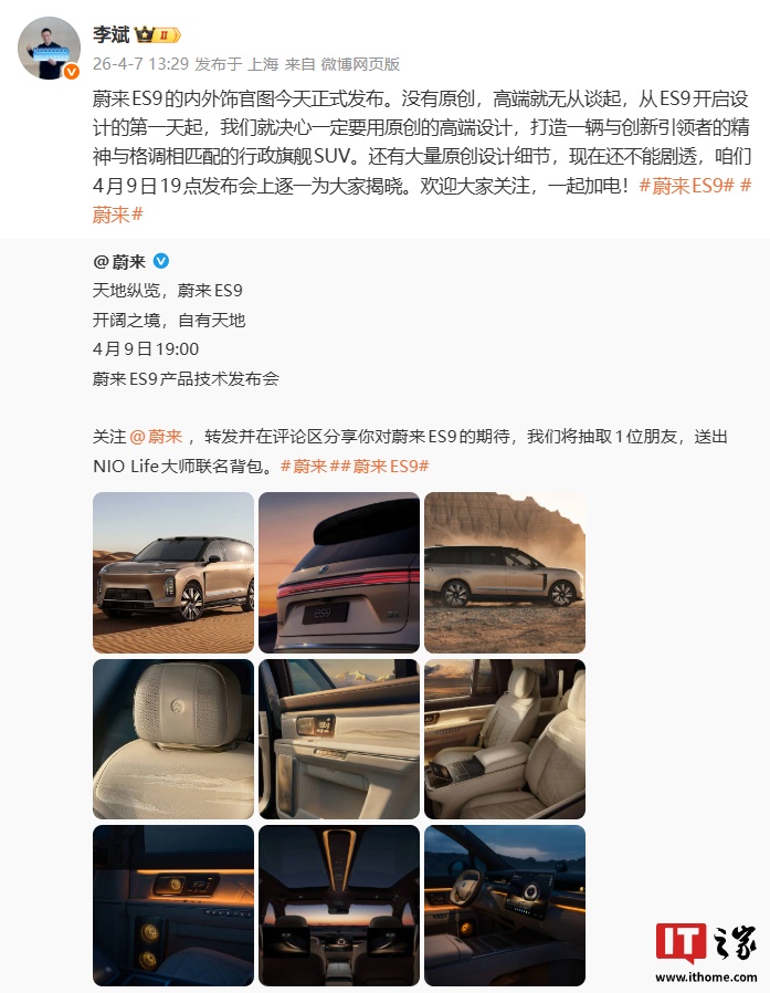 IT之家 4 月 7 日消息,蔚来官方今日公开了 ES9 旗舰 SUV 的外观及内饰情况,新车技术发布会将在 4 月 9 日举行。