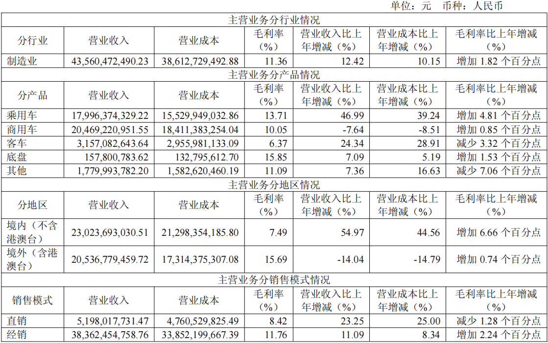 根据年报,2025年公司销售各类整车及底盘38.41万辆,同比下降4.72%。其中,商用车销量为23.5万辆,乘用车销量为14.9万辆。从主营业务分产品来看,乘用车营业收入为179.96亿元,同比增长46.99%;商用车营业收入为204.69亿元,同比下降7.64%;客车营业收入为31.57亿元,同比增长24.34%。
