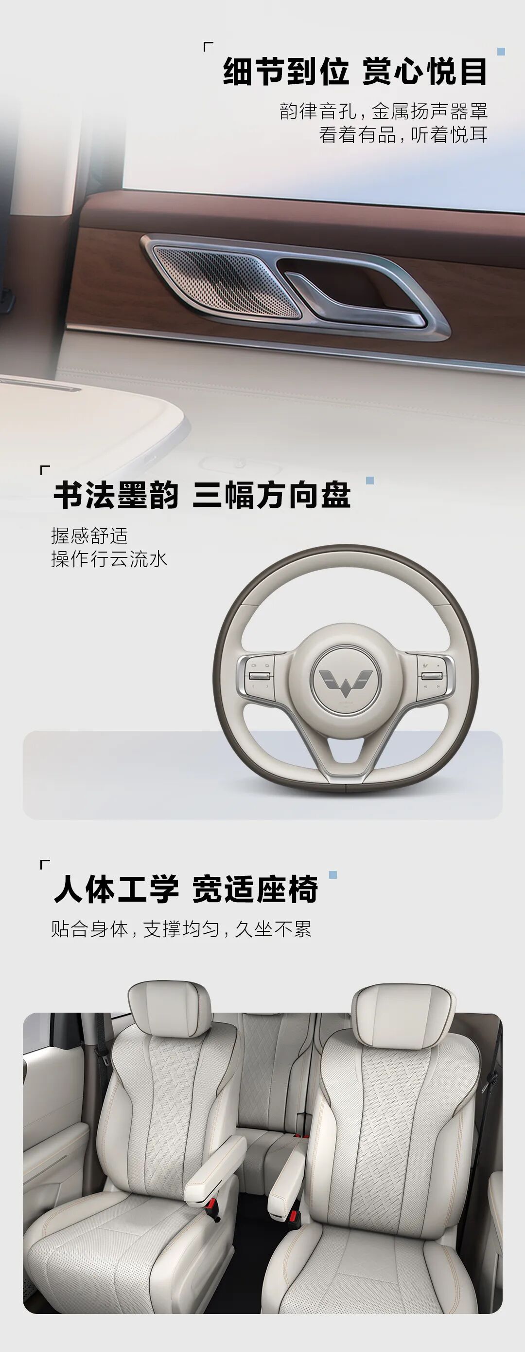 星光 L 的方向盘融入书法墨韵灵感,木纹饰板镭雕擦色工艺打造原木触感,还有金属扬声器罩,奈落孔格纹采用方胜纹样。