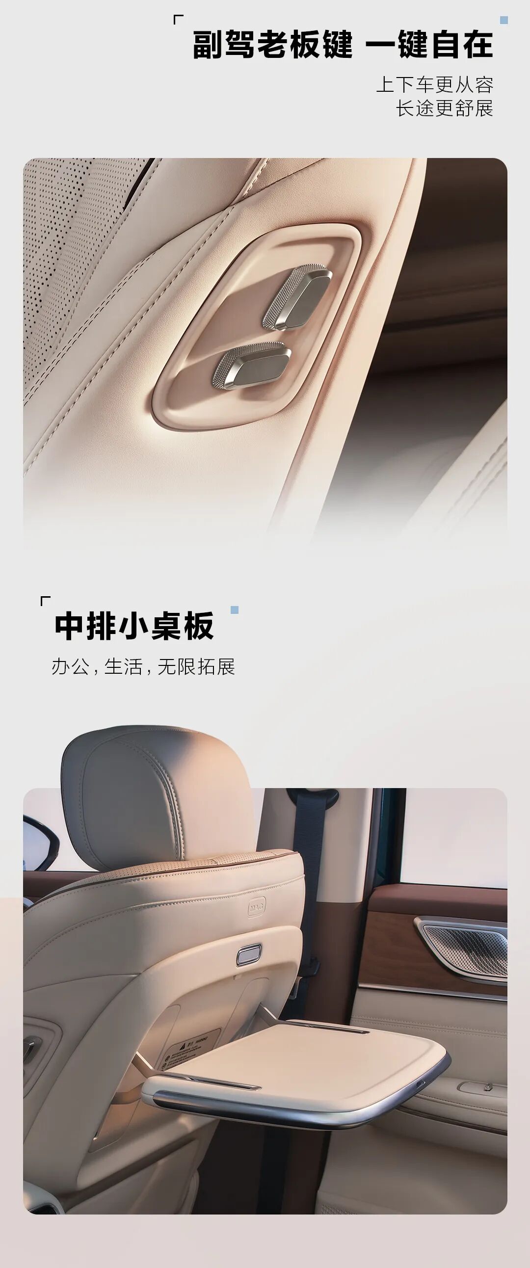 星光 L 整车搭载 8.8 英寸仪表屏 +15.6 英寸中控屏,配备 256 色全色域呼吸氛围灯,支持固定 / 随机 / 驾驶三种模式;还有副驾老板键,二排乘客可一键调节副驾;二排小桌板。