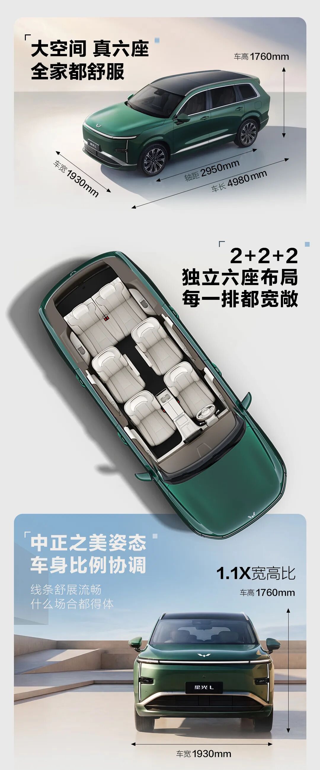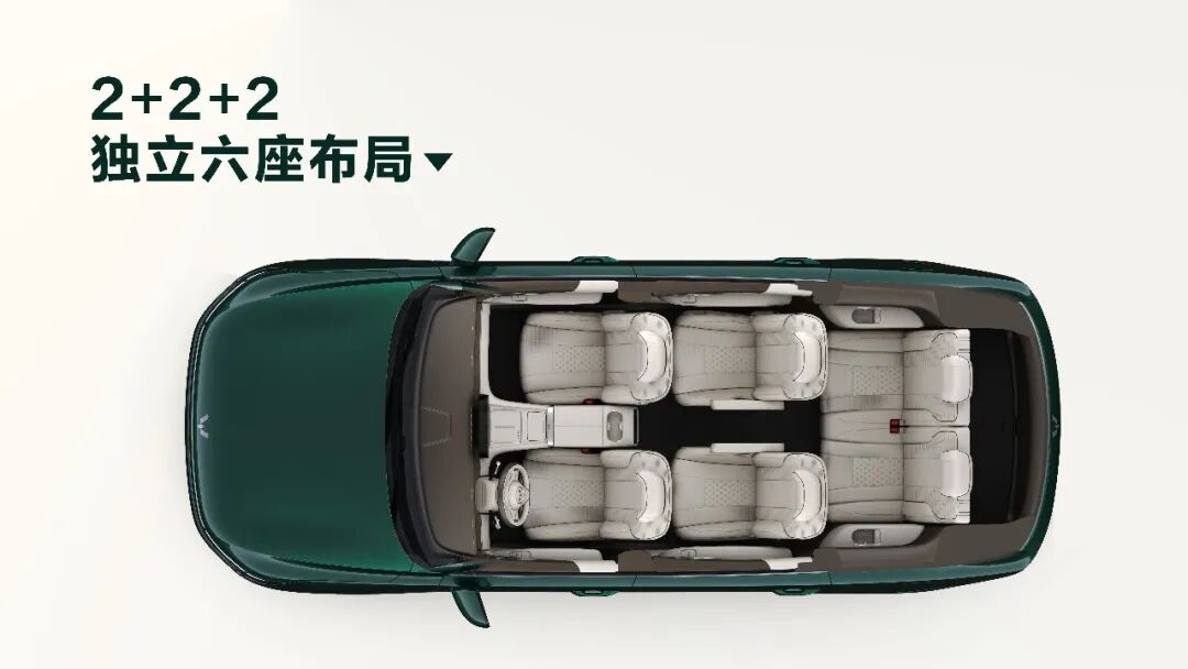 星光 L 插混版提供 260km 纯电续航(CLTC),整车尺寸达到 4980mm×1930mm×1760mm,轴距达 2950mm,采用 2+2+2 独立六座布局。